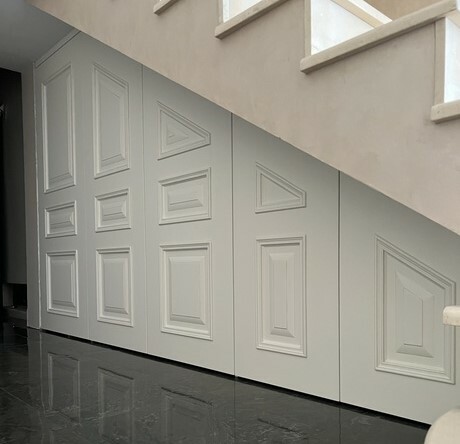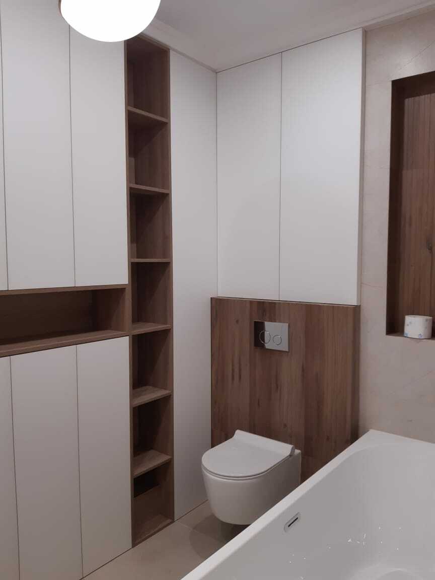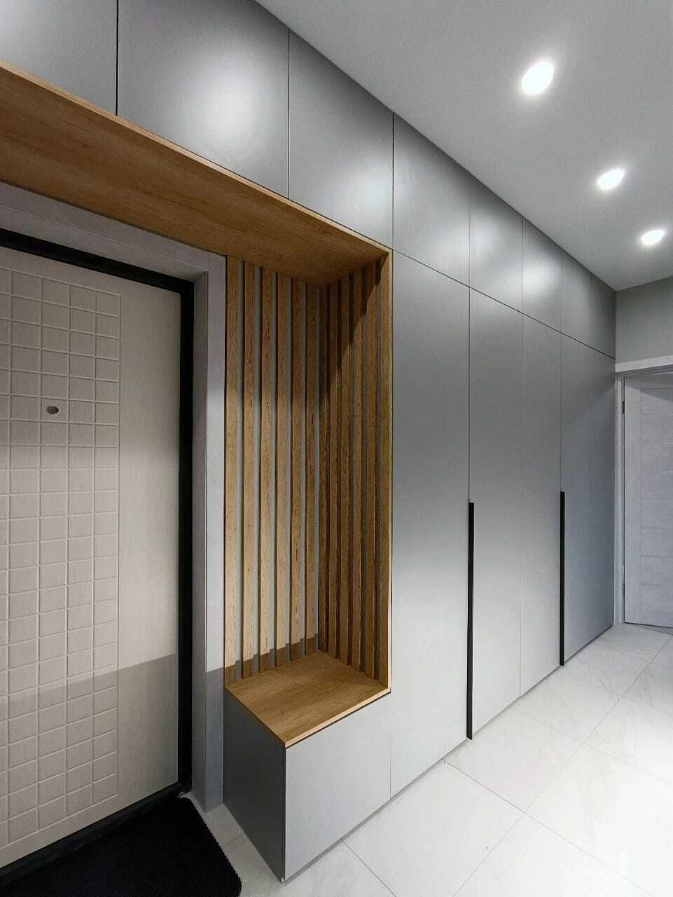 Фасады МДФ эмаль мат с фрезеровкой, корпус ЛДСП EGGER, система открывания дверей Hattich TopLine, петли Blum, внутри встроенная подсветка