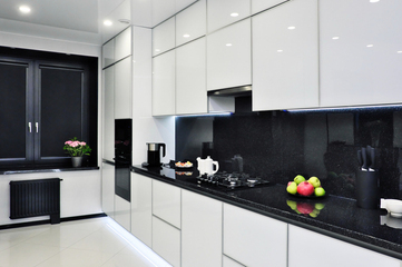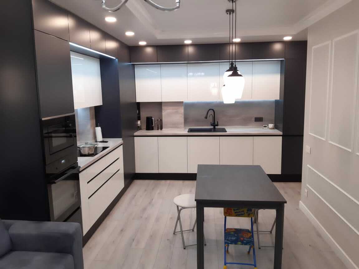 Фасады МДФ эмаль мат, корпус ЛДСП Egger, фурнитура Blum, интегрированная ручка черного цвета, система открывания дверей Hattich TopLine, подсветка