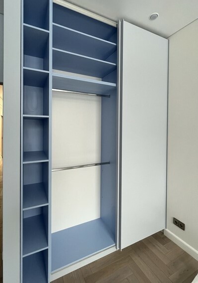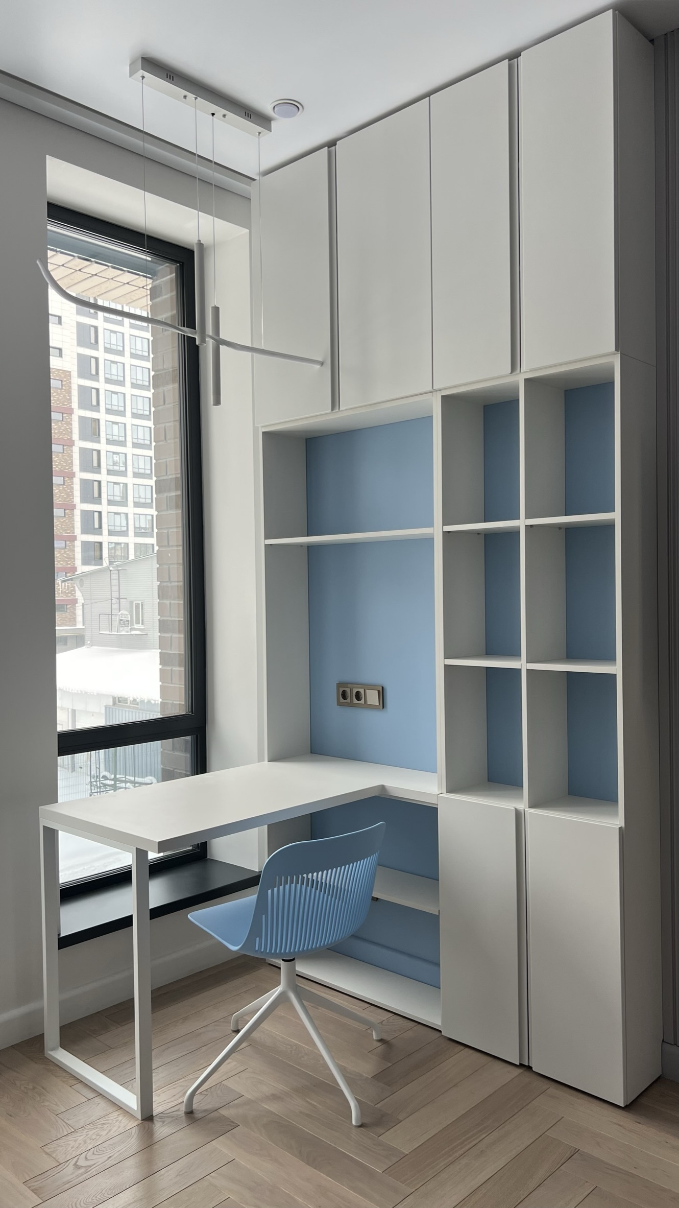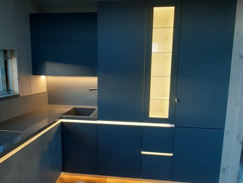 Фасады МДФ эмаль мат, корпус ЛДСП голубой горизонт, фурнитура Blum, интегрированная ручка крашенная в цвет фасада, система открывания дверей Hattich TopLine, подсветка
